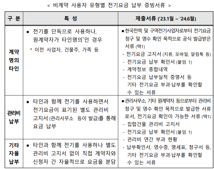 단, 20만 원 미만일 경우, 2023년 1월부터 2024년 6월까지 전기요금 영수증 일체가 필요합니다.