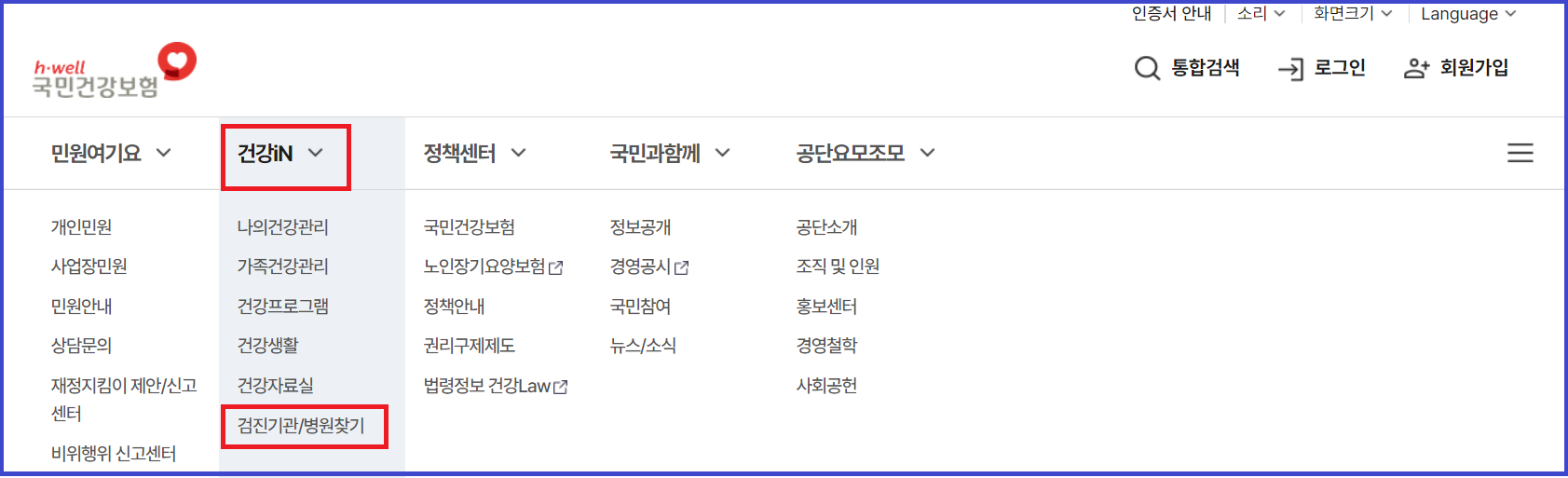 1. 국민건강보험 홈페이지 메인에서 [건강 in]에 있는 [검진기관 / 병원 찾기]를 클릭합니다.