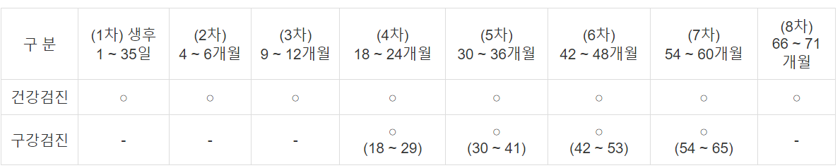 - 연령별로 총 8회 (구강검진 4회) 검진 실시