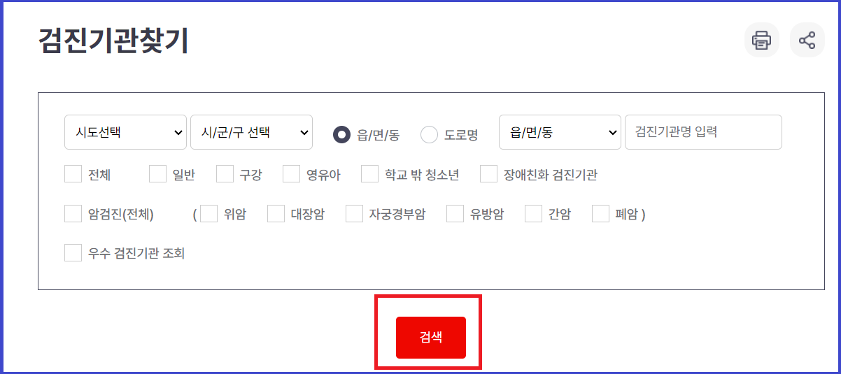 2. 검진받을 위치를 선택한 후 [검색]을 클릭합니다.
