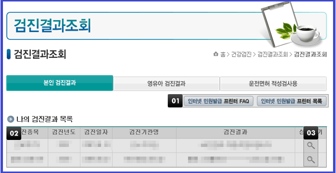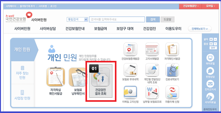 1. 국민건강보험 홈페이지 접속 및 로그인 실시 후, 개인민원 중 건강검진결과 조회를 클릭합니다.