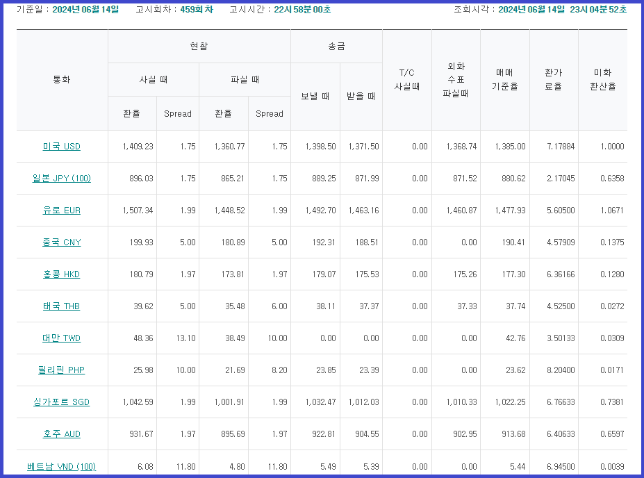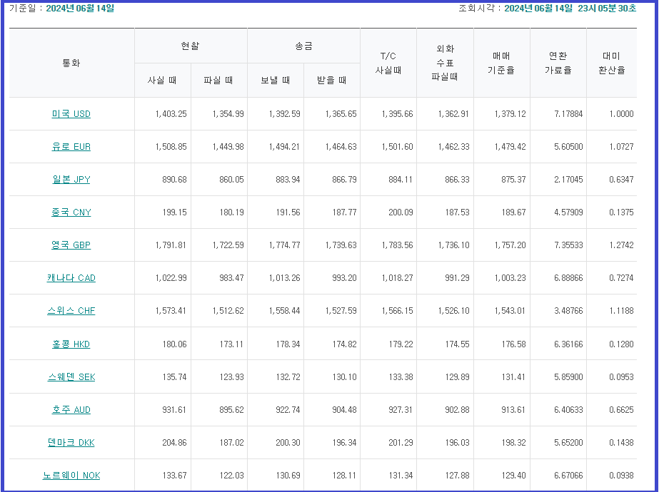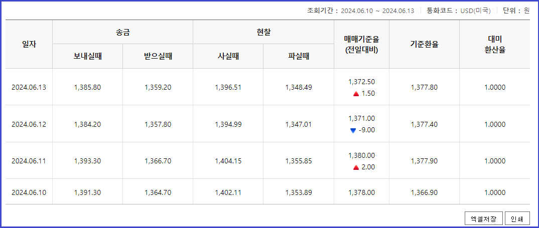 3. 조회기간 (2024.6.10 ~ 2024.6.13) 동안의 환율이 조회됩니다.