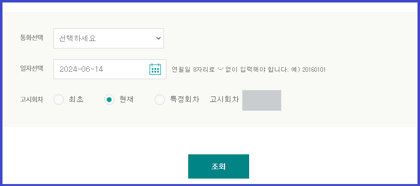 통화를 선택한 후, 일자를 선택하시고 조회하시면 됩니다.