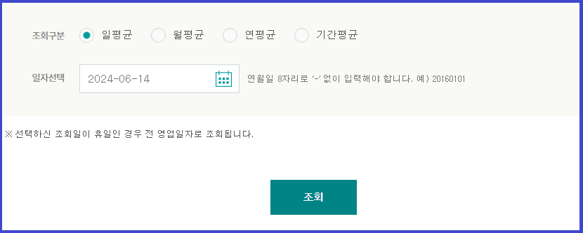 조회구분 (일편균, 월평균, 연평균, 기간평균) 선택, 일자를 선택한 후 조회를 실시합니다.