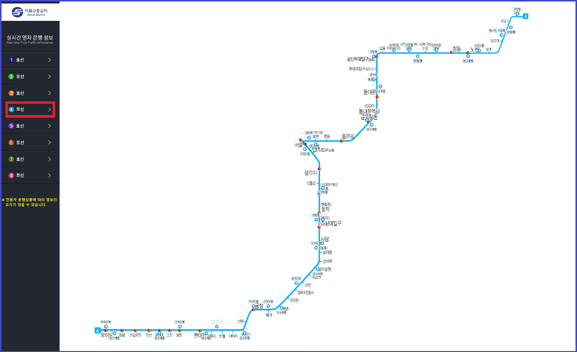 4호선은 파란색(스카이블루)으로 구성되어 있으며, 세부 노선명은 서울 지하철 4호선 입니다.