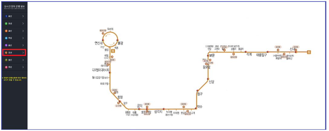 6호선은 황갈색으로 구성되어 있으며, 세부 노선명은 서울 지하철 6호선 입니다.