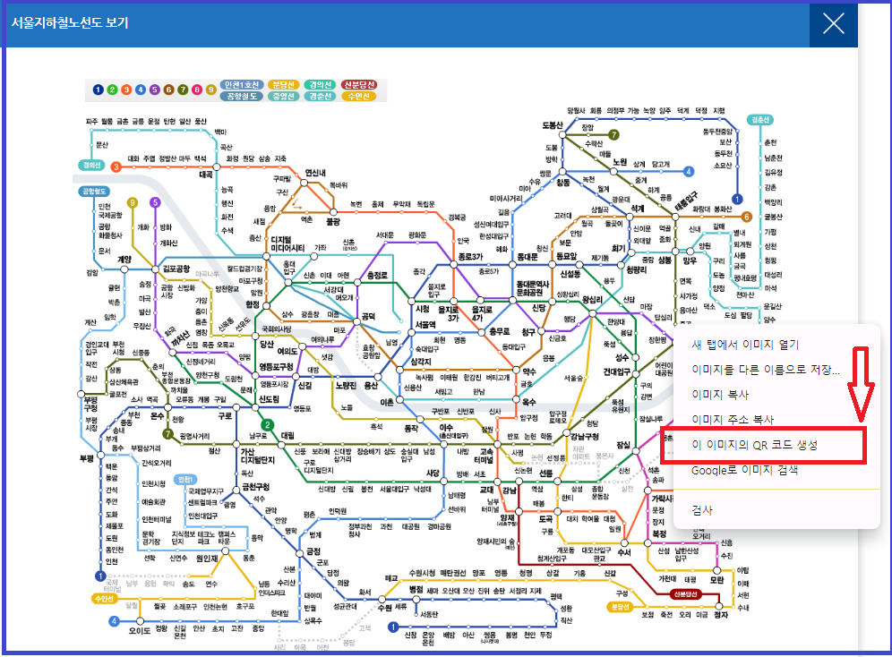 전체노선도에서 마우스 오른쪽을 누르면, 이미지의 QR 코드 생성을 클릭하면 됩니다.